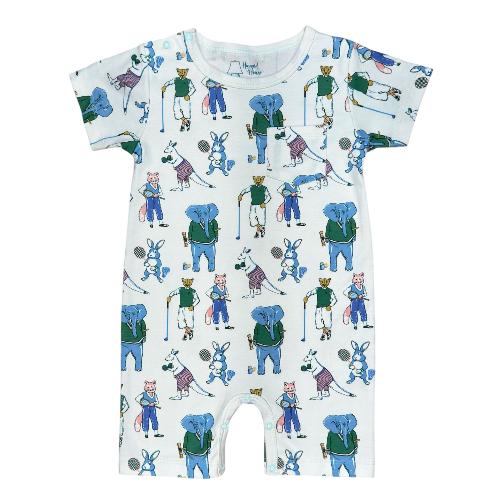 This baby boy knit Athletic Animal Club Romper is perfect for active little ones. Made with a comfortable and soft fabric, it features a playful animal print that will keep your baby entertained. Designed for maximum movement, your little one will stay comfortable and stylish all day long.