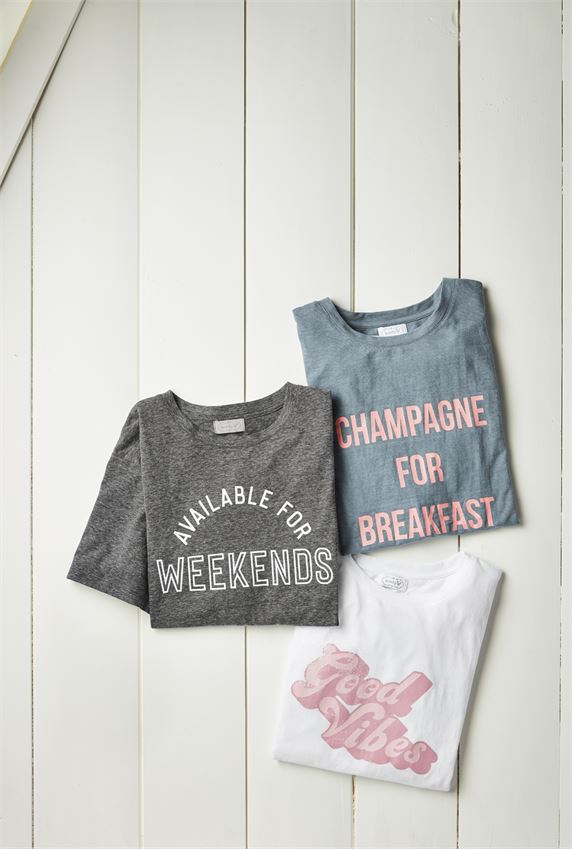 Short sleeve cotton blend tee features graphic sayings and an oversized fit. Measures approximately 27" from shoulder to hem on size small/medium. Arrives folded with cardstock band.