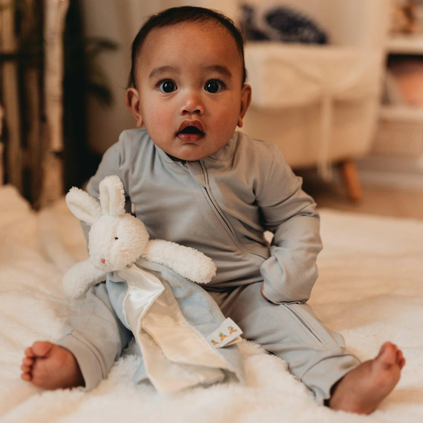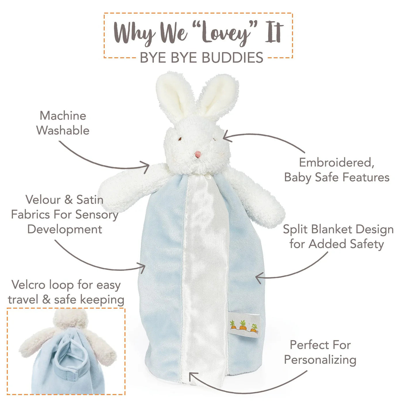 A smaller version of our best-loved Buddy Blanket, this Lovey is ready to be on the go. With a handy loop on the back to attach to the car seat, stroller or crib you're sure to never be left without this precious friend again. This favorite security blanket is a plush floppy eared bunny with handcrafted, baby-safe embroidered face and a snuggly soft blue velour split blanket, lined and edged in silky satin. Signature three carrot tag for little one's fingers.