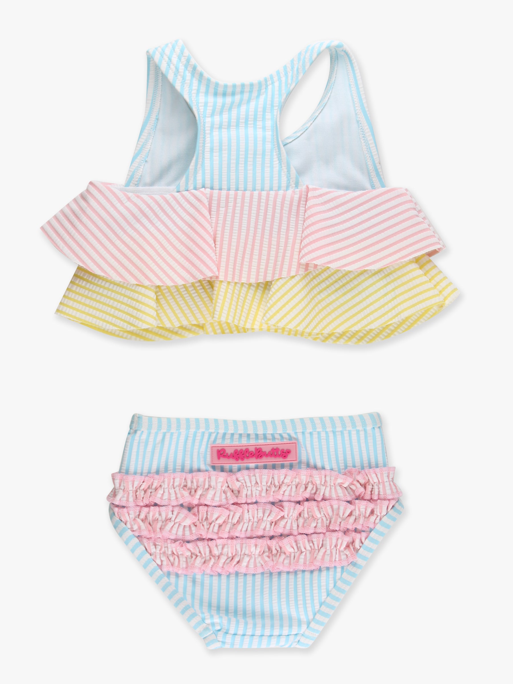 Three of our classic seersuckers combine to make a fun colorblock effect! Bright and sweet, and easy to coordinate with the whole family. This fun and girly flounce bikini features wide, comfortable straps and two flouncy layers on the top. The lined bottoms are full-coverage and won't ride up. Made with UPF 50+ fabric for built-in sun protection.