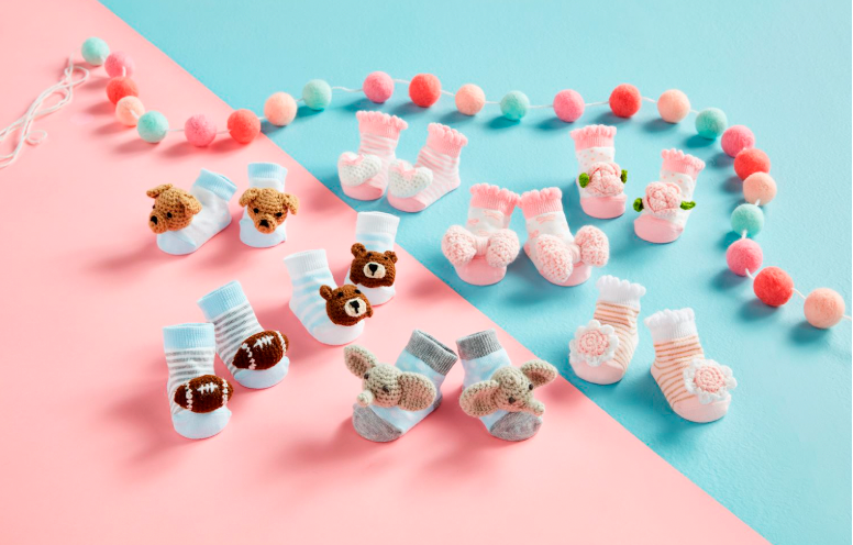 Cotton hosiery socks with crochet knit rattle on toes. Comes in cotton rope display basket.