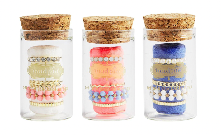 Set of four gem stone, pearl and pavé rhinestone layering rings. Come in corked glass jar.