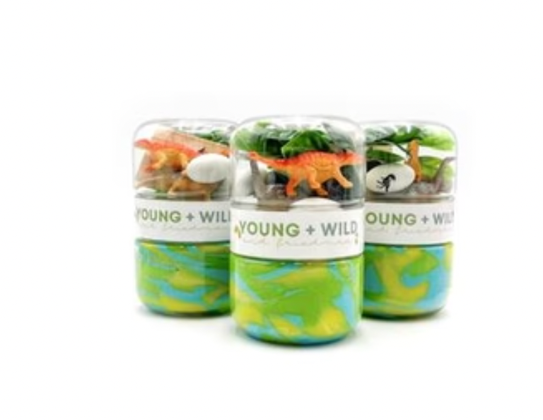 The Dinosaur Grab & Go Dough Jars come with one jar of our amazing all-natural sensory dough and a separate screw-on jar filled with everything you need to make the cutest prehistoric scene! *Dough will be solid green*