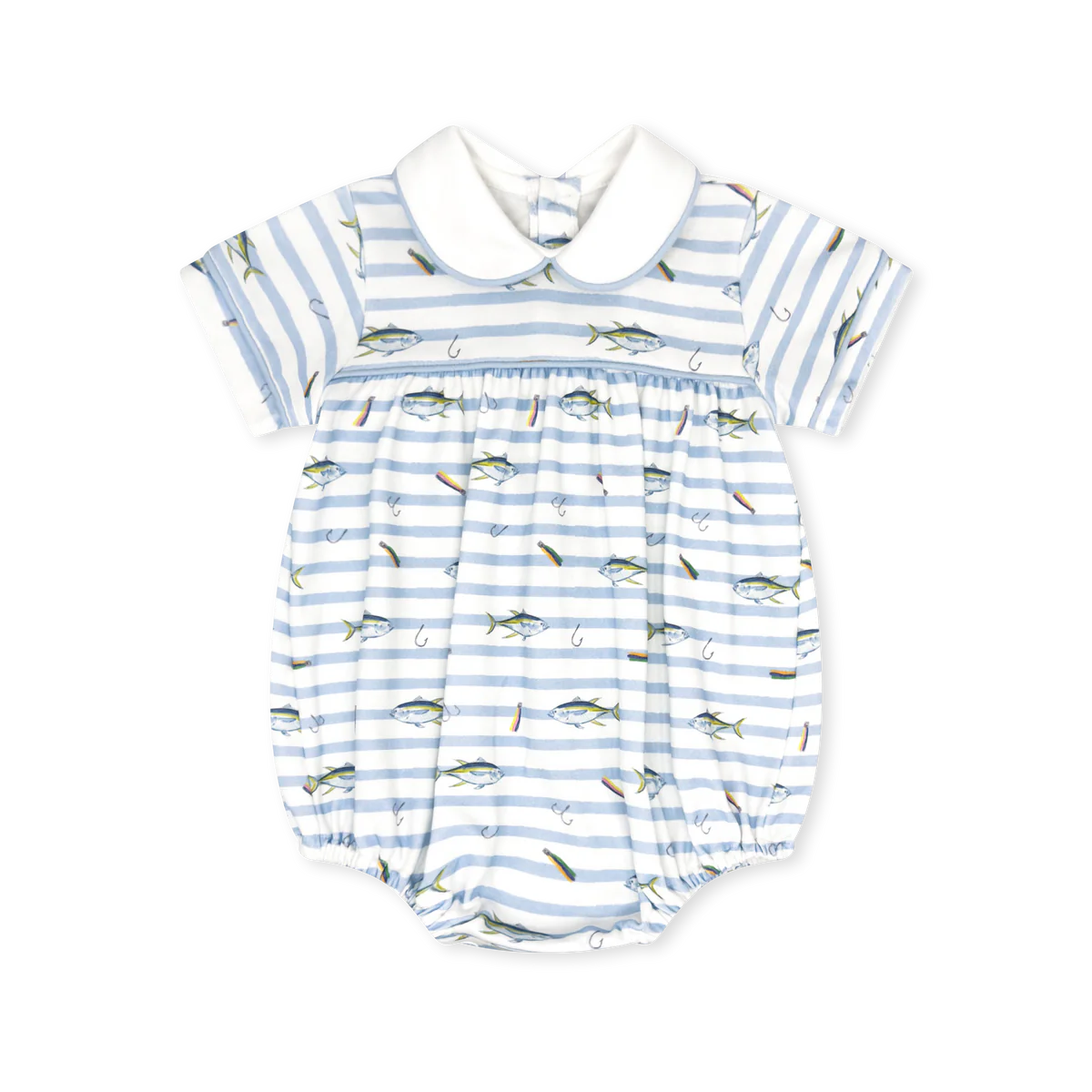 Our Lullaby Set classic Covington Bubble is now available in our custom Fish Tales print in knit with Buffton Blue piping. This dreamy bubble creates a stylish look for your little one's playful adventures.