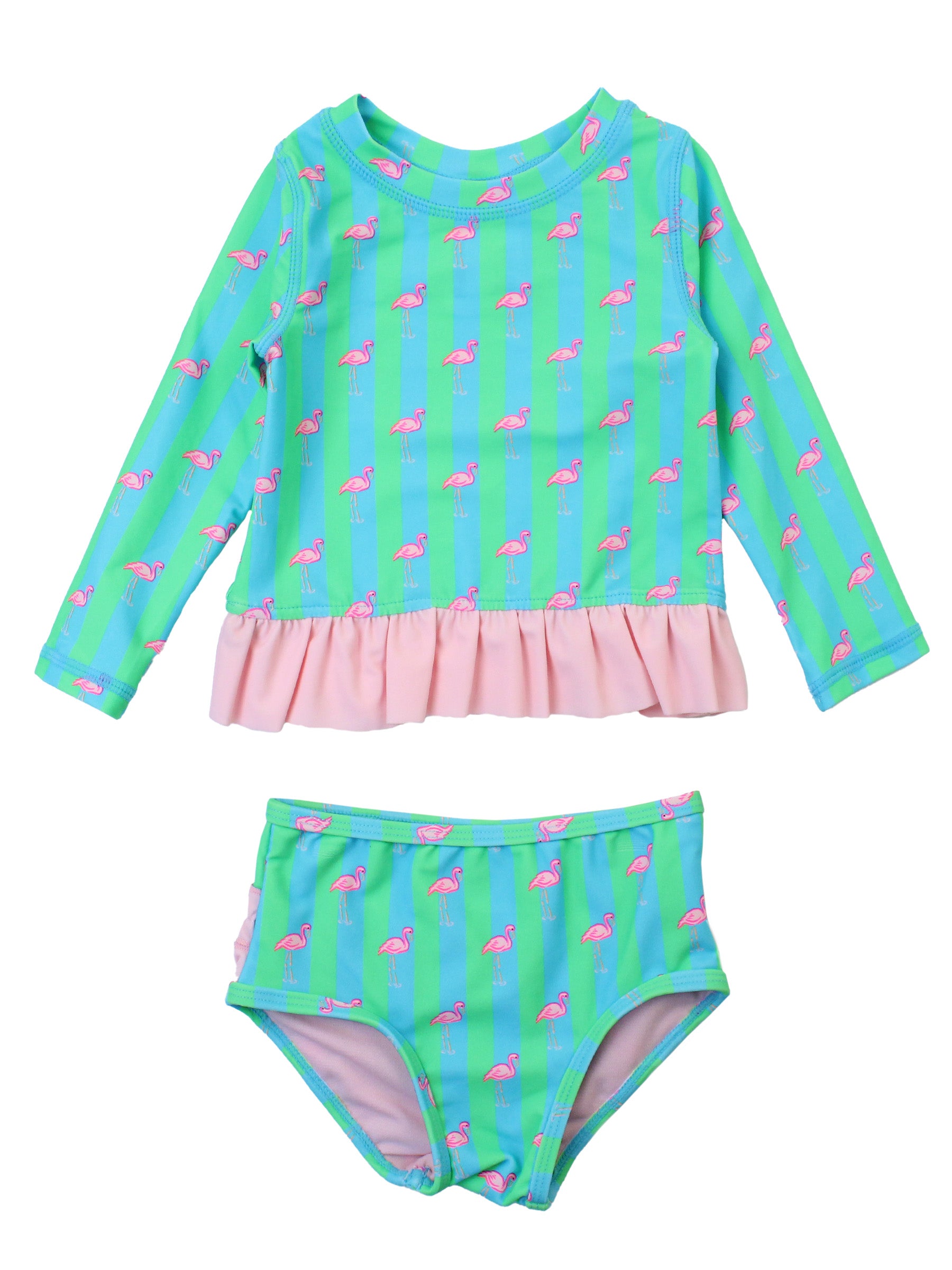 This Flamingo Stripe Rash Guard Bikini is perfect for little girls who love flamingos and want to stay protected in the sun. The rash guard offers UPF 50+ protection, ensuring safe fun in the sun. The playful flamingo stripe pattern adds a fun touch to this practical and stylish swimwear.