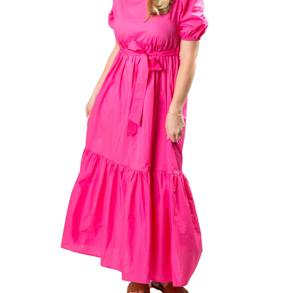 New! This dress is a timeless blend of chic and classic style. It features an empire waist that flows into a single tier maxi length dress. A tie sash wraps around the waist that makes the sizing easy and comfortable. The puffed short sleeves are elasticized for a comfy fit, while the v-neckline offers an oh-so-flattering look. The back zipper provides an effortless way to slip into and out of your dress. The poplin-like material gives it a fresh, crisp look that's perfect for any occasion. Style this with a Top It Off straw hat and clutch for a wow-worthy look! 100% cotton.