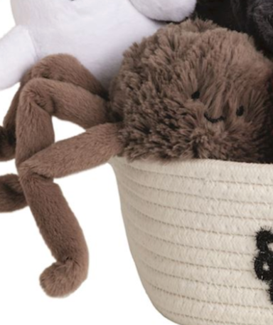 Faux fur plush with weighted seat. Comes in cotton rope display basket.