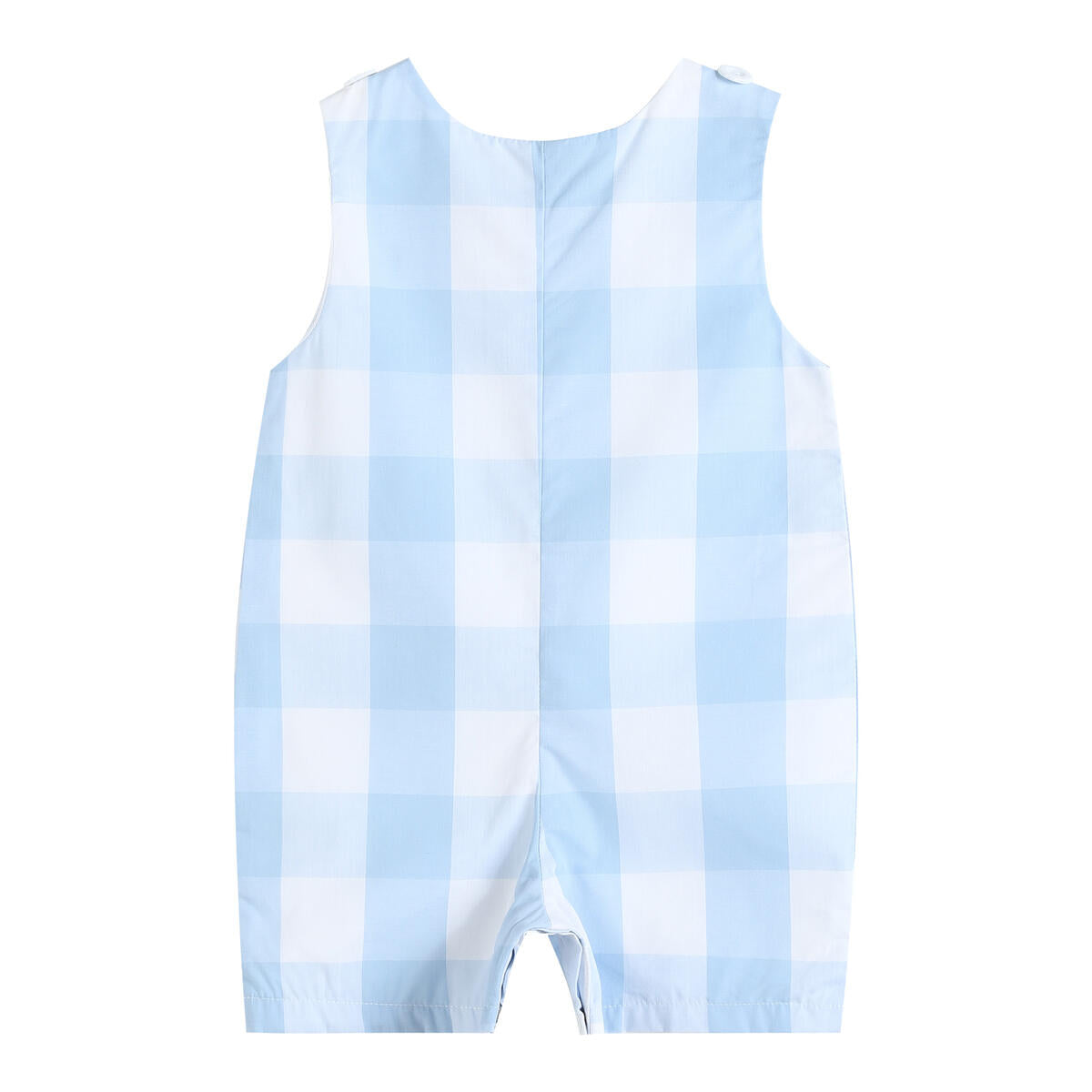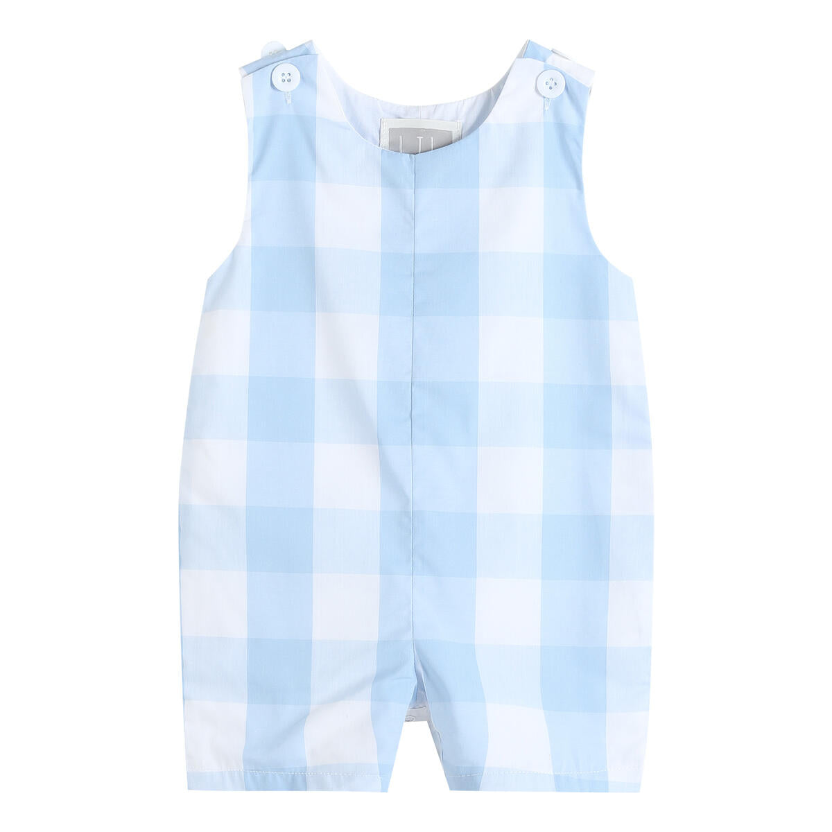 "Add a touch of sweetness to your little boy's wardrobe with our Large Blue Check Jon Jon! Perfect for Easter and warm weather, this adorable outfit will have your little one looking cute and feeling comfortable. Don't miss out on this must-have piece!"