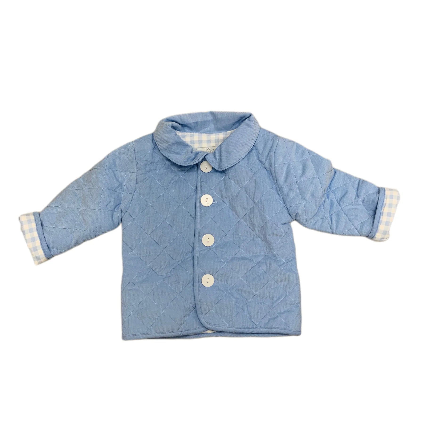 Light blue quilt coat with plaid lining. Available in pink and navy.