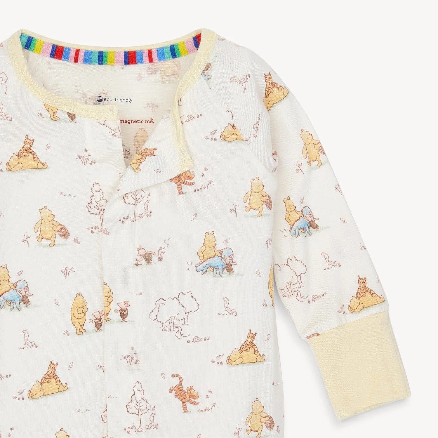 Moments with friends coverall/grow with me. you're invited to a place where dressing with magnets is a magical experience + beloved Disney characters spark the imagination of every child. Meet our grow with me convertible coverall, a one-piece that lets you adjust its features as your baby grows. Magnetic closures ensure quick and quiet changes, and foldover cuffs for hands and feet extend the length and life of the coverall. Made of eco-friendly TENCEL™ modal that's silky soft, breathable, and gentle on sensitive skin, this is one piece of clothing baby won’t outgrow in the blink of an eye.