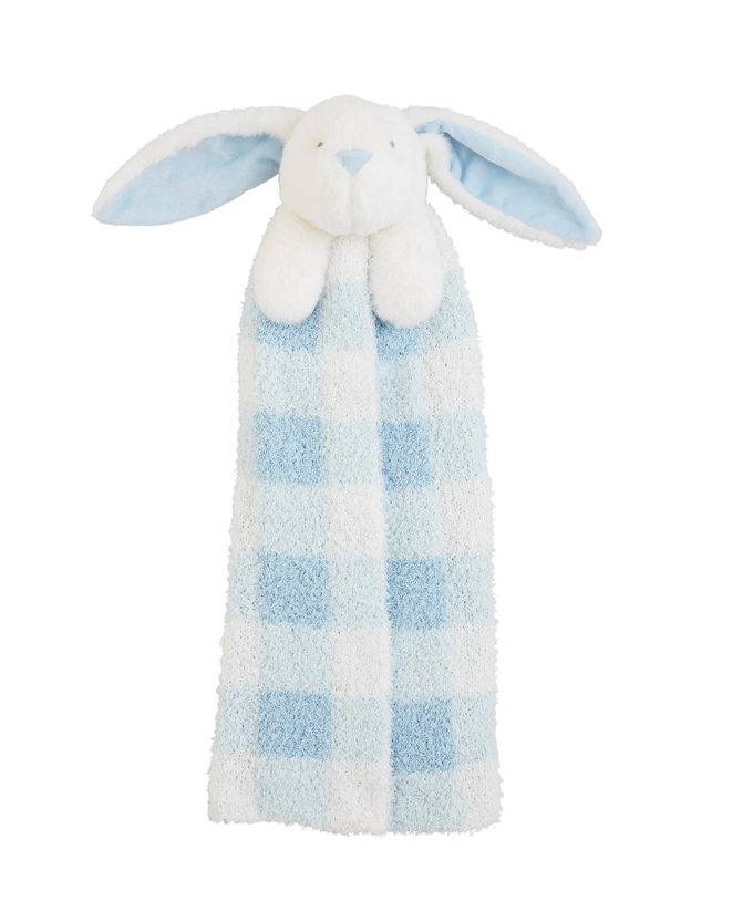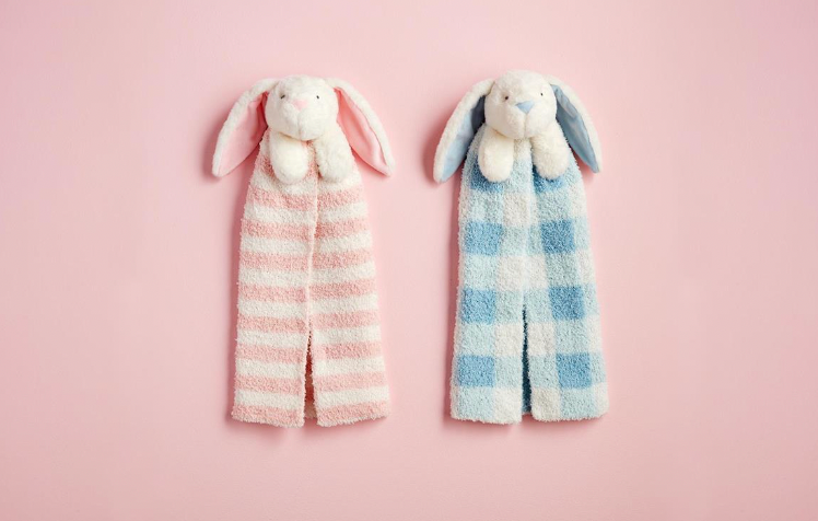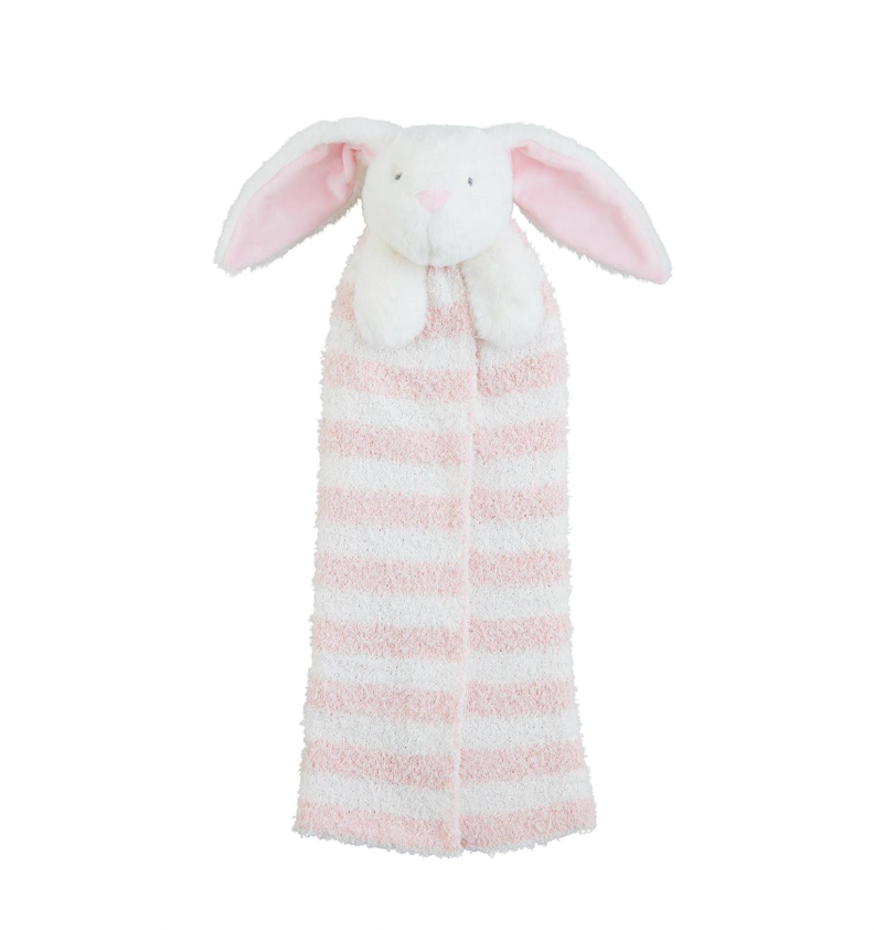 Embroidered faux fur bunny with chenille lovie skirt features lullaby sound chip.