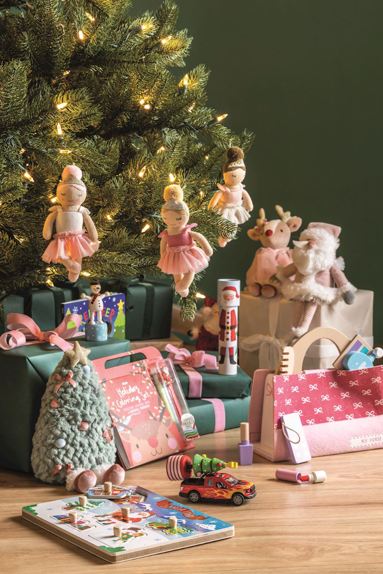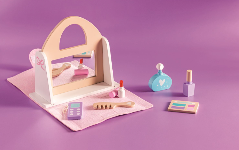 7-piece set. Clever felt and wood purse holds wood and felt accessories for pretend play including phone, perfume, lipstick, nail polish, comb and eye shadow palette. Ages 3+.