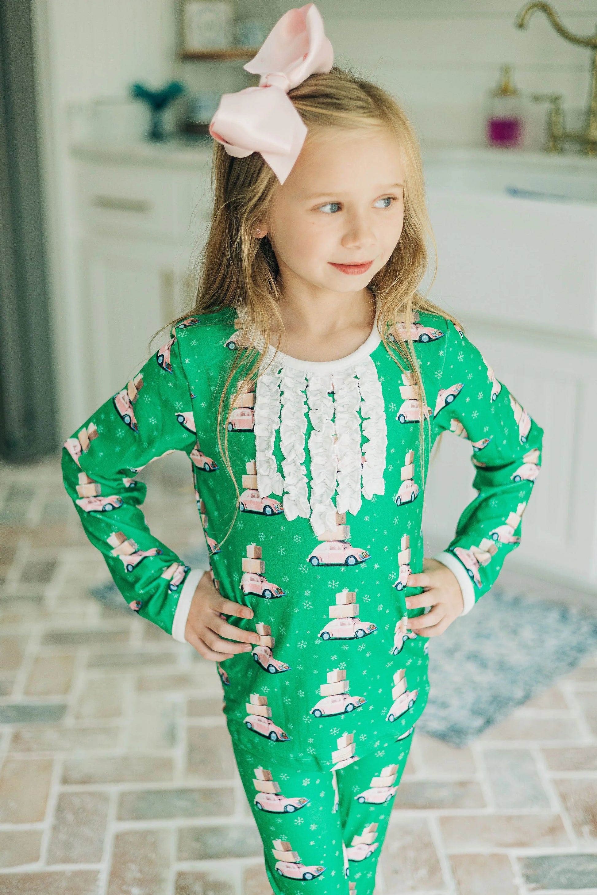 Make your little one's holiday season extra special with these Ruffle Buttflap PJs! Featuring a vintage pink car pattern, this fun and festive sleepwear will make bedtime more exciting. Plus, with its cozy materials, your kiddo is sure to have sweet dreamzzz!
