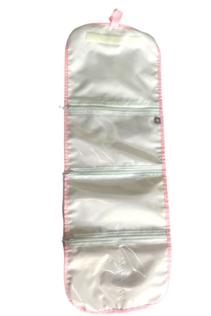 The Hang Around is truly the perfect organizer. Sporting a velcro loop hanger & 3 zip pockets with 4 wipeable dividers, you can store travel items, jewelry, makeup, or even diaper bag contents all in one compact bag! This bag is carry-on friendly by folding flat and securing with the velcro fastener. Embroidery stitches will be hidden with a secret open pocket. Perfect for overnight camp kids, the locker room, travel, bridal party gifts, dorm rooms, new moms and dads, and even as an emergency kit in the glove compartment!