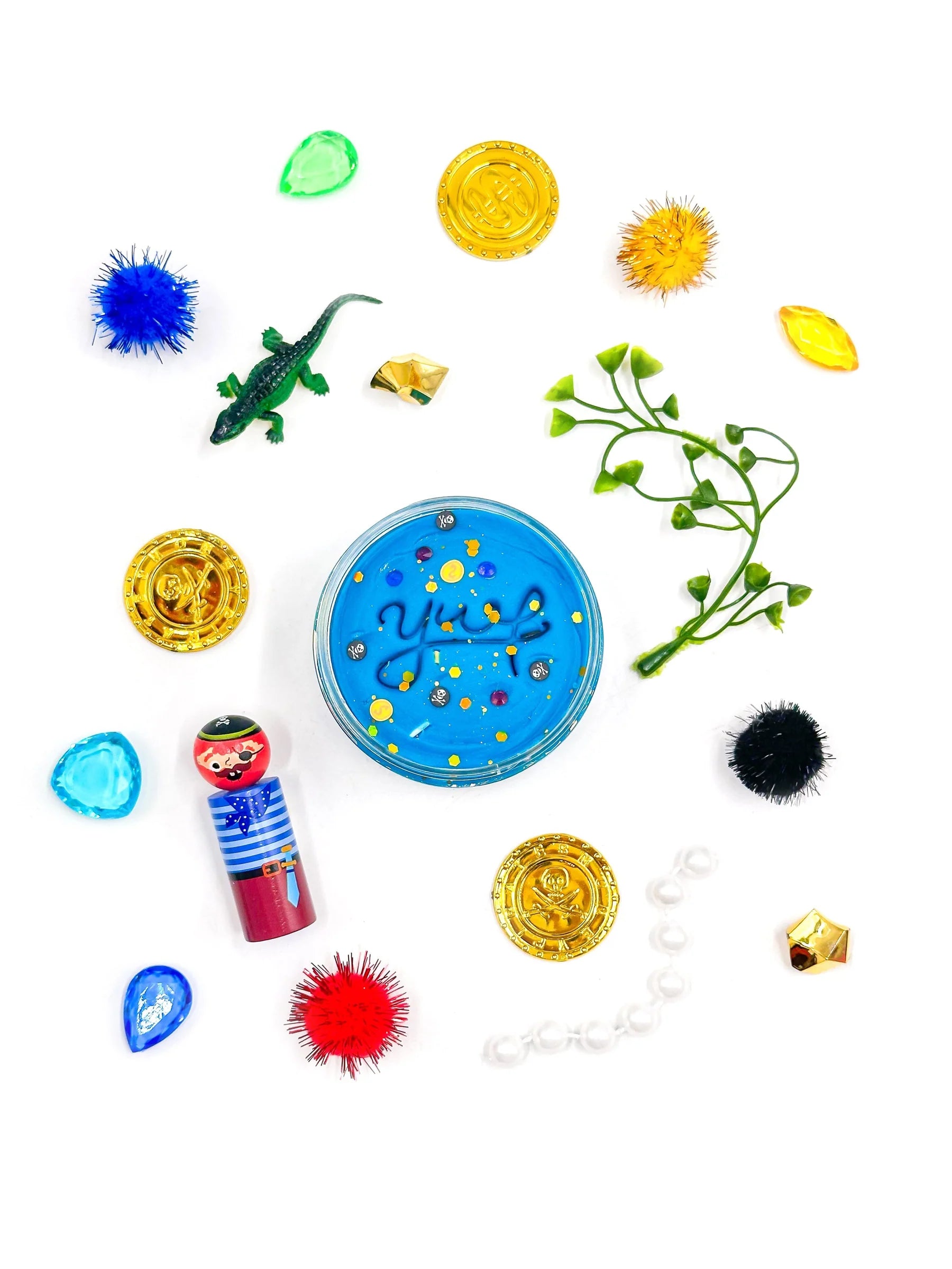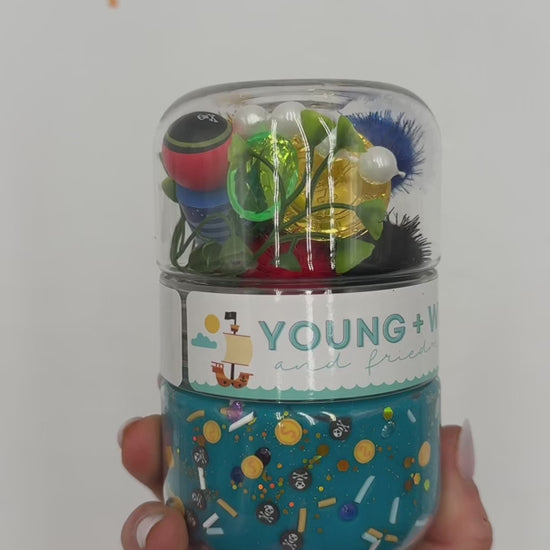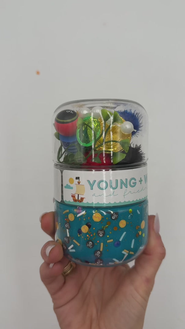 The Pirate Grab & Go Dough Jars come with one jar of our amazing all-natural sensory dough and a separate screw-on jar filled with everything you need to make the cutest scene!