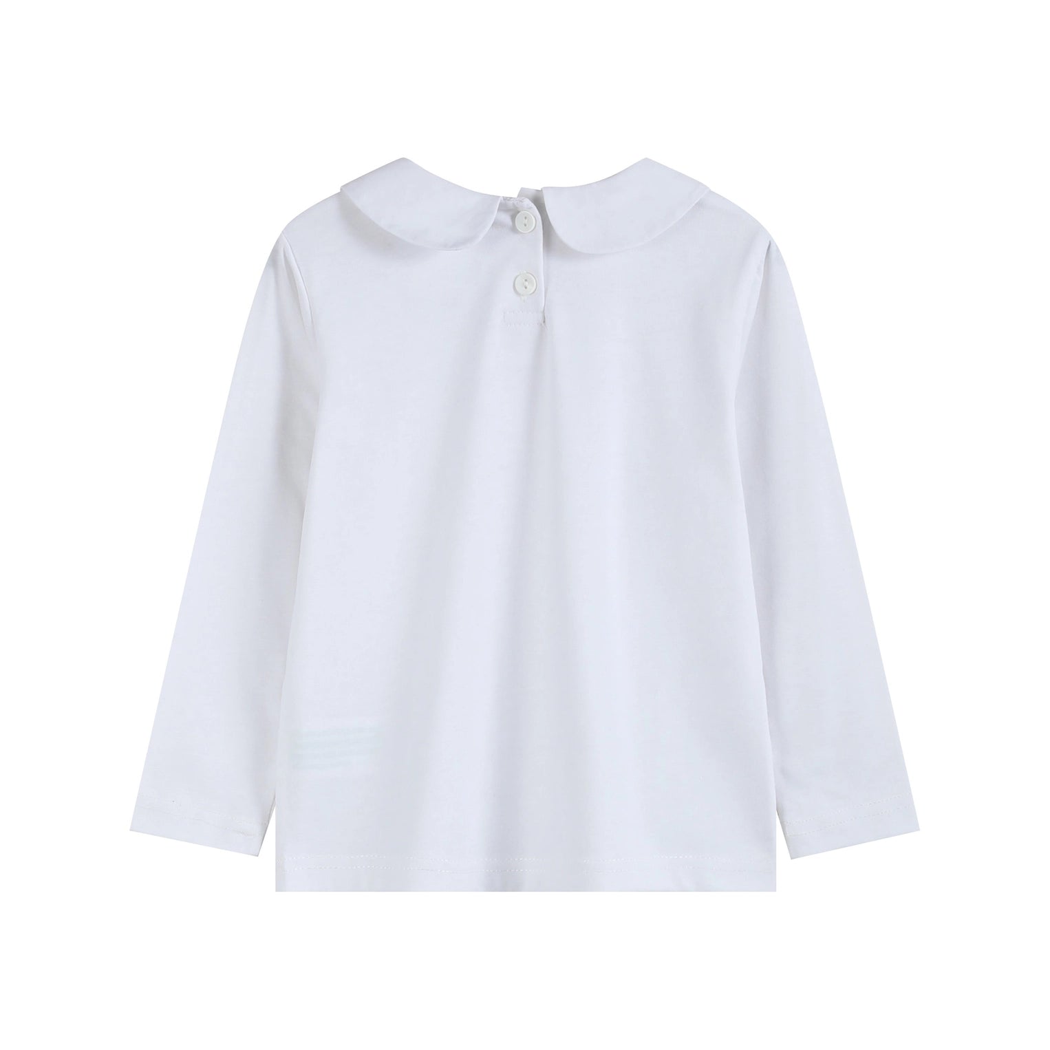 Celebrate the season with this White Cotton Santa Collared Shirt, perfect for little girls. Made from 100% cotton for comfort and softness, this long-sleeved shirt features an adorable collar embroidered with festive Santas. Ideal for Christmas gatherings or seasonal wear, it pairs beautifully with our Ruffle Jumper Dresses.