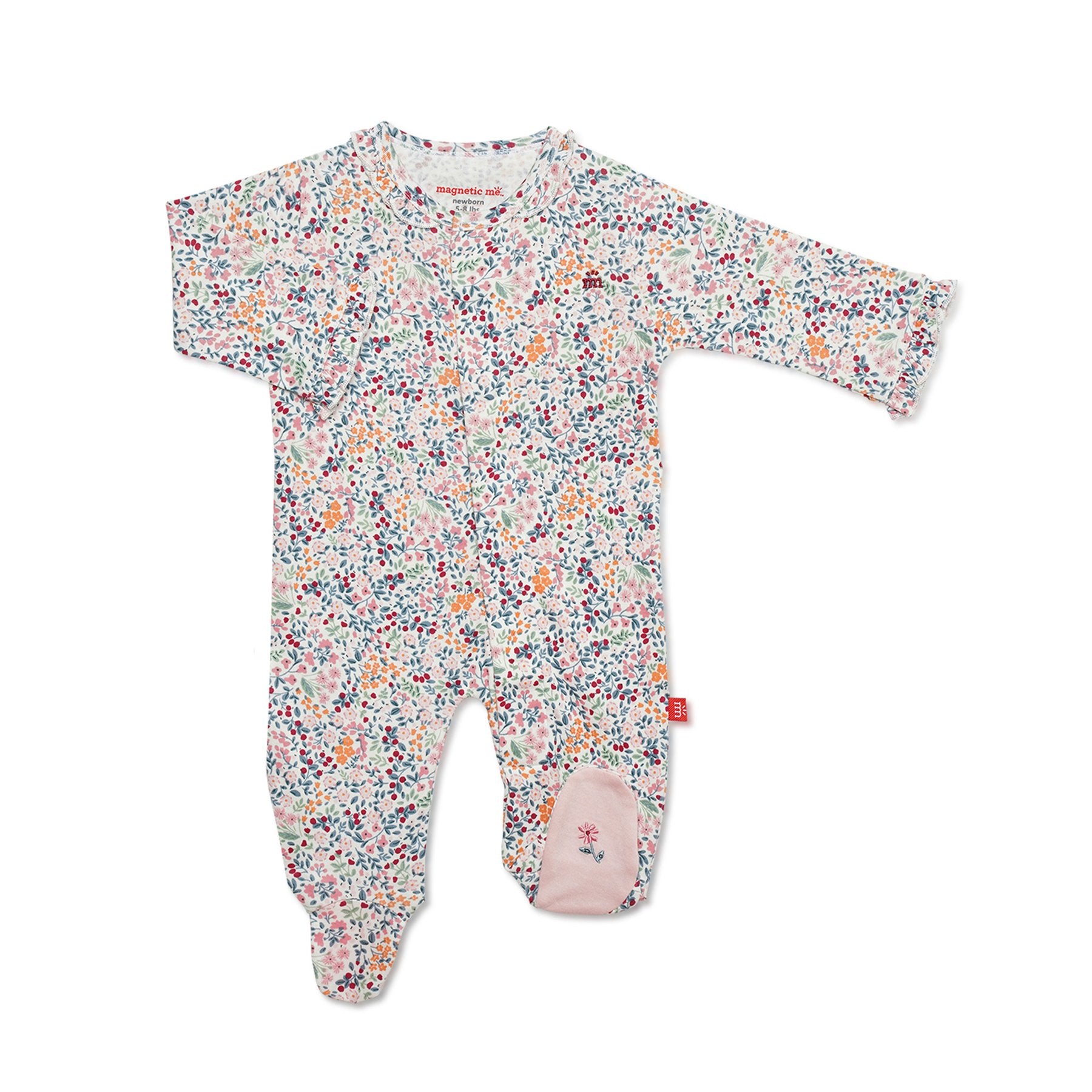 A soft, stylish all-day and all-night wardrobe staple with smart magnetic fasteners that makes changing time easy as 1, 2, 3. With our no over-the-head design, simply open the outfit, insert baby, and BOOM, DONE! - the footie practically closes itself. Machine wash as directed.