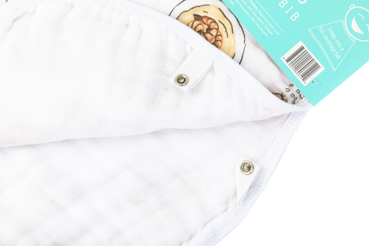 Little Hometown's Baby Burp and Bib combo is a great transitional item. It can be used as a burp cloth in the early months, and then it snaps to convert into a full-coverage bib once solid foods are introduced. This unisex item is a great idea for all baby showers