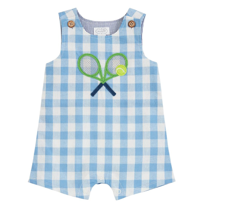 Lined gingham Jon Jon features chest applique and coconut wood button shoulder straps. Inner leg snaps.