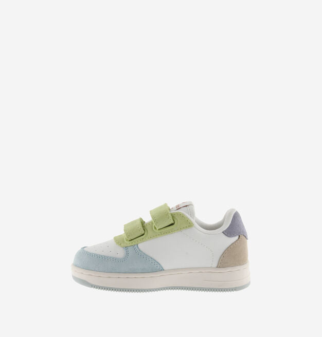 Tiempo nylon sneaker with contrast split leather panels and two-tone sole. With straps for the perfect fit against the foot. With three straps in sizes from 36 for an improved grip. Comfy and versatile.