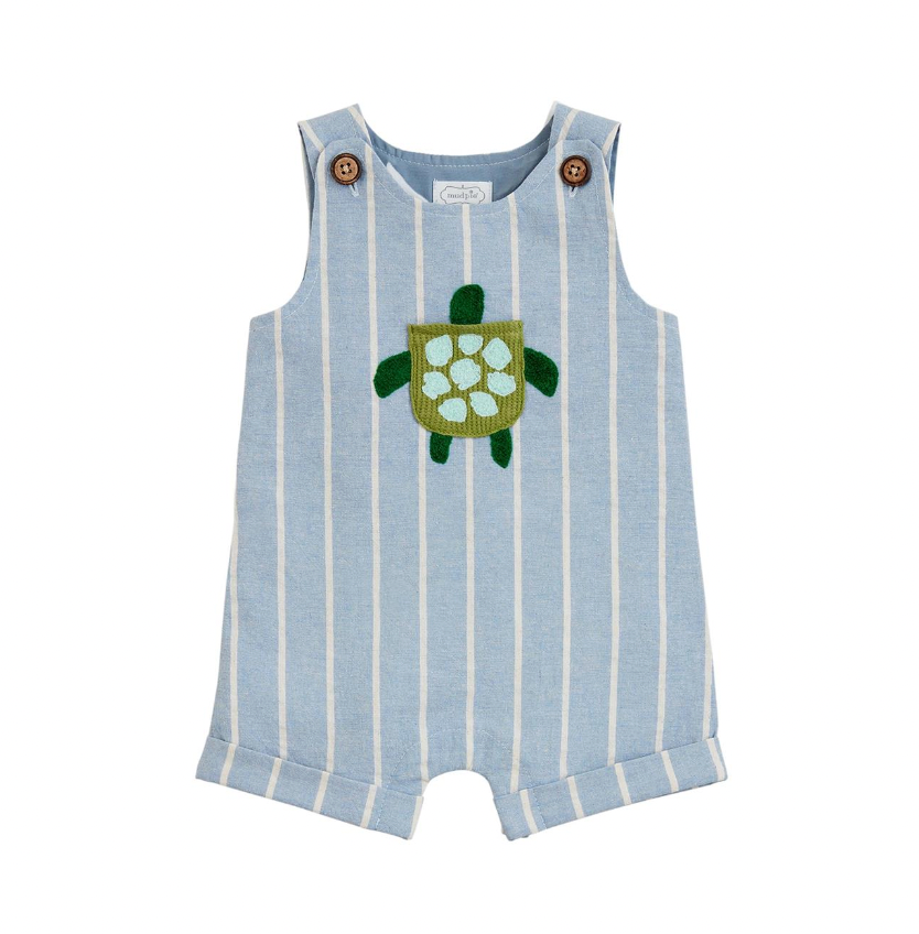 Linen shortall features turtle applique pocket, coconut wood button shoulders and inner leg snaps.