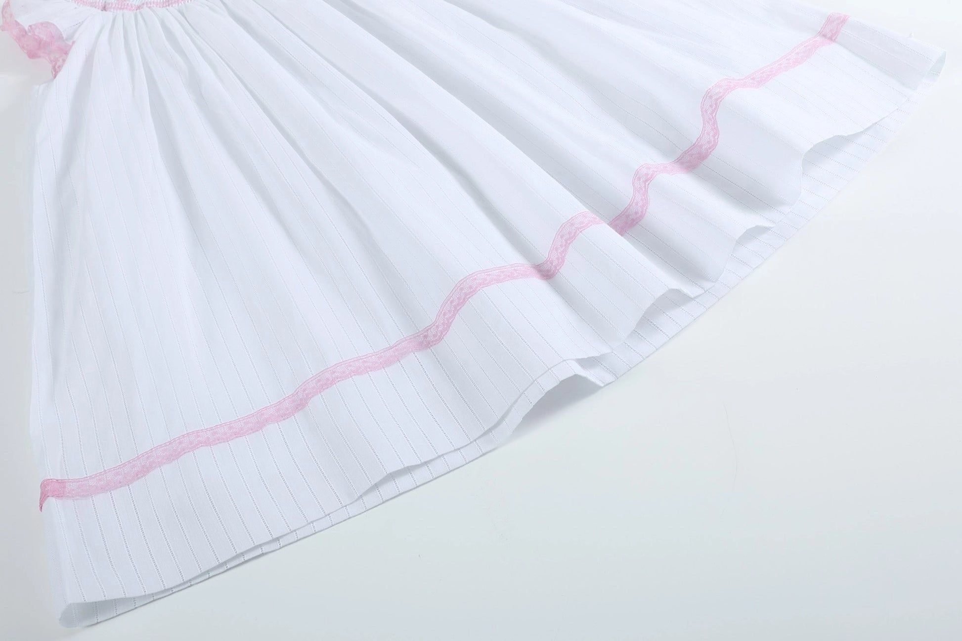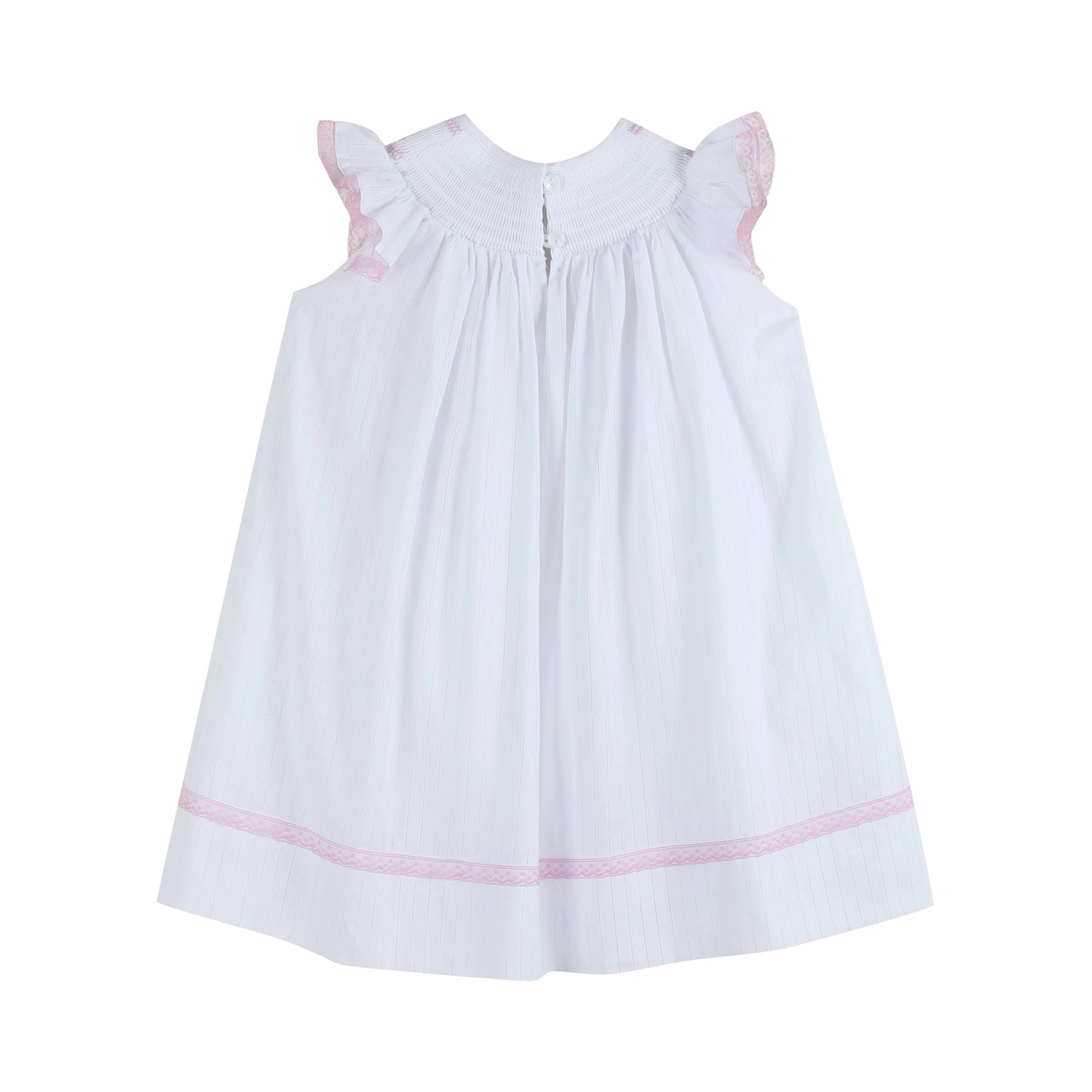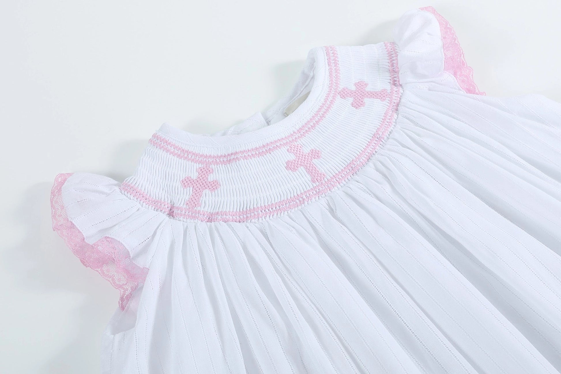 "Dress your baby girl in style with our White & Pink Crossed Smock Bishop! This charming dress features a unique smock design in soft white and pretty pink for a delicate and adorable look. Perfect for any occasion, your little one will look and feel absolutely precious in this dress."